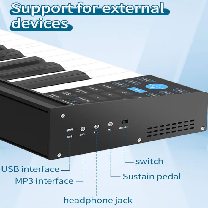 ورودی هدفون 1 عدد ،قابلیت اتصال به پدال ساستین،ورودی midi، صدای Aux، ورودی USB ، ورودی mic، ورودی mp3(قابلیت اتصال به اسپیکر)